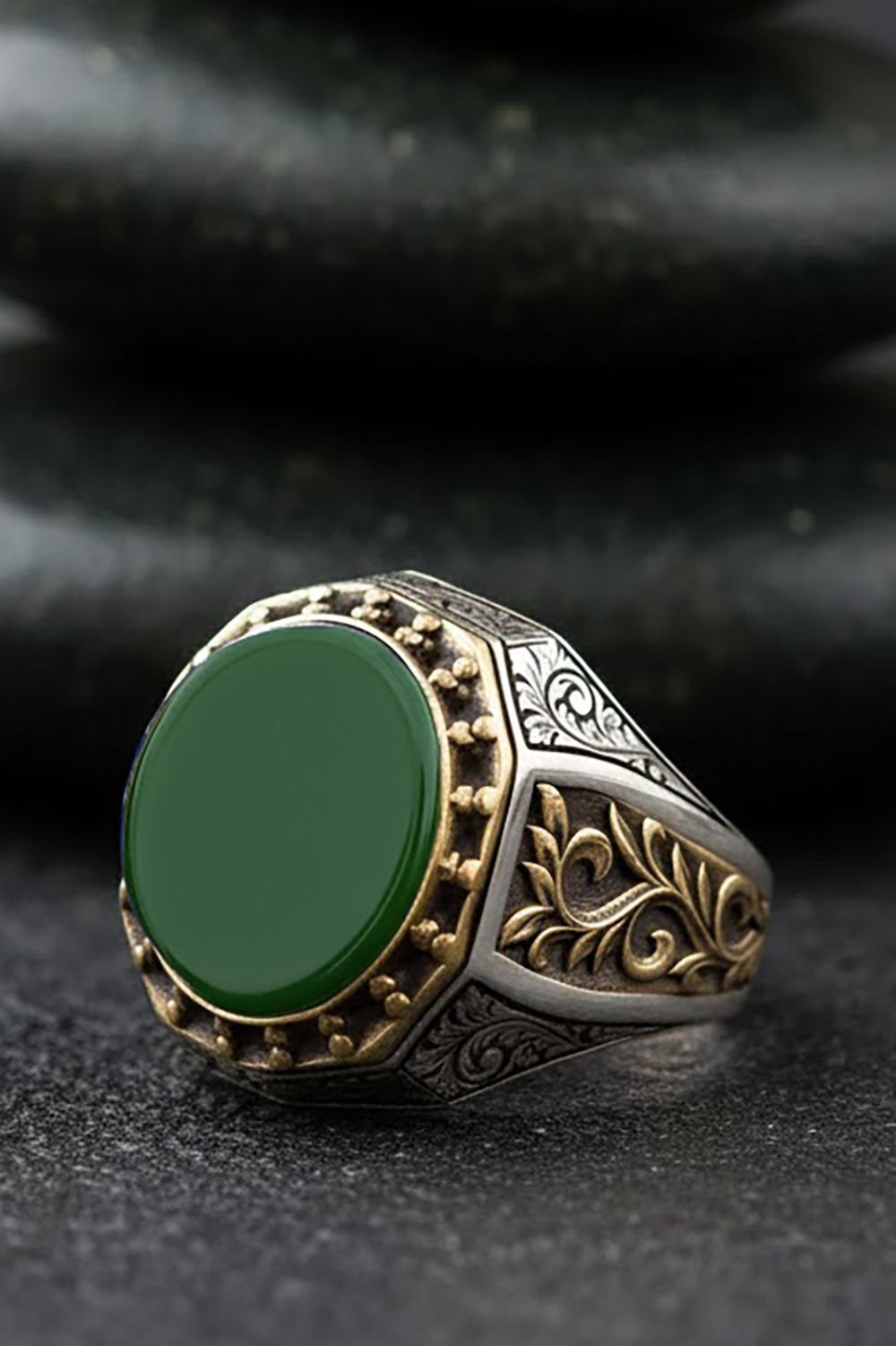 Hakiki ve orijinal doğal taşlar kullandığımız yüzüklerin bu modelinde Yeşil Akik taşını kullanıyoruz.
