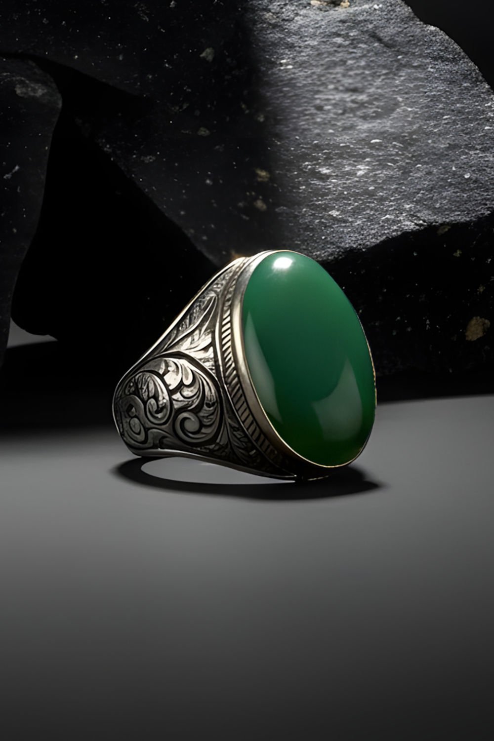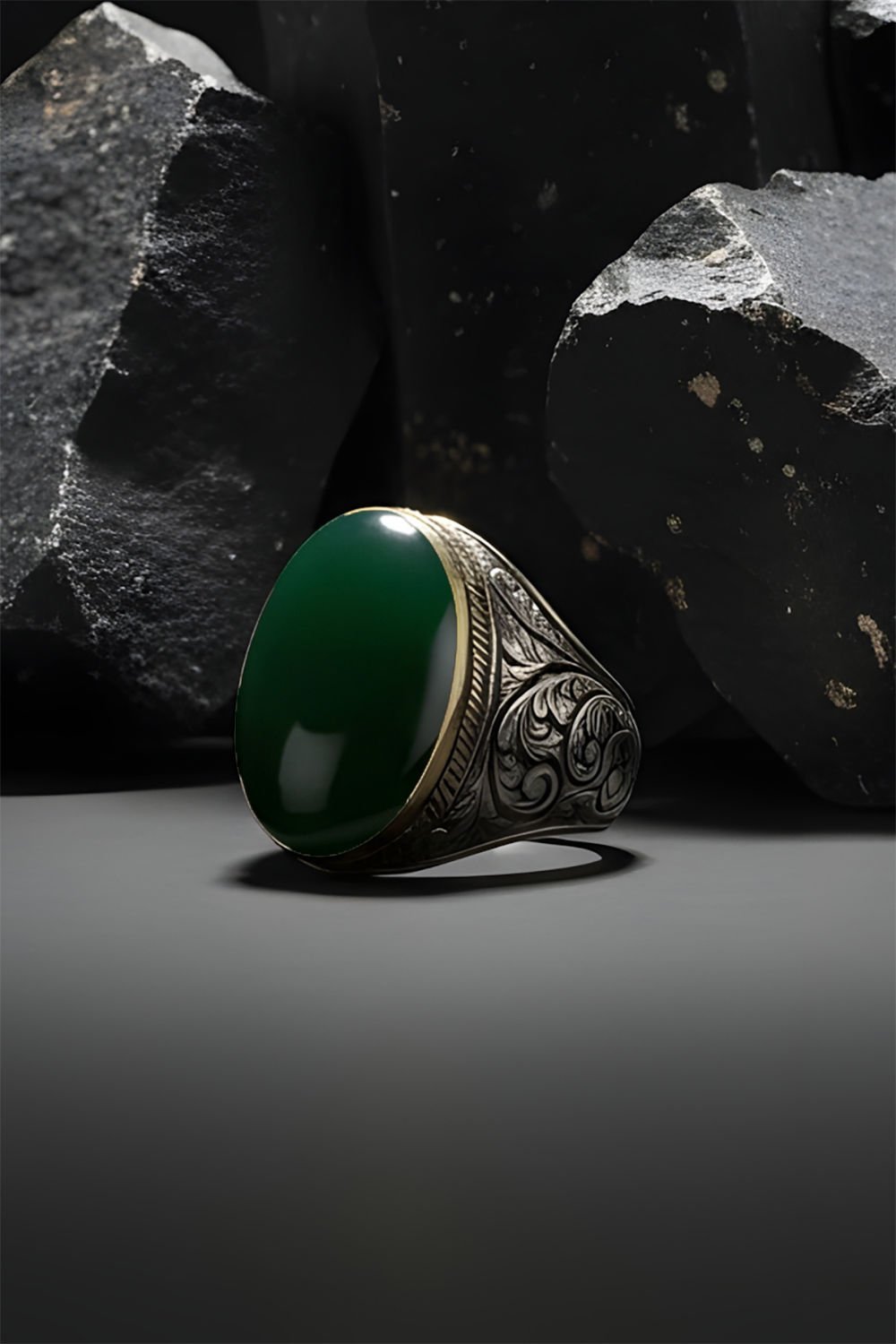Yeşil Akik Taşlı Gravür Desenli Gümüş Yüzük |