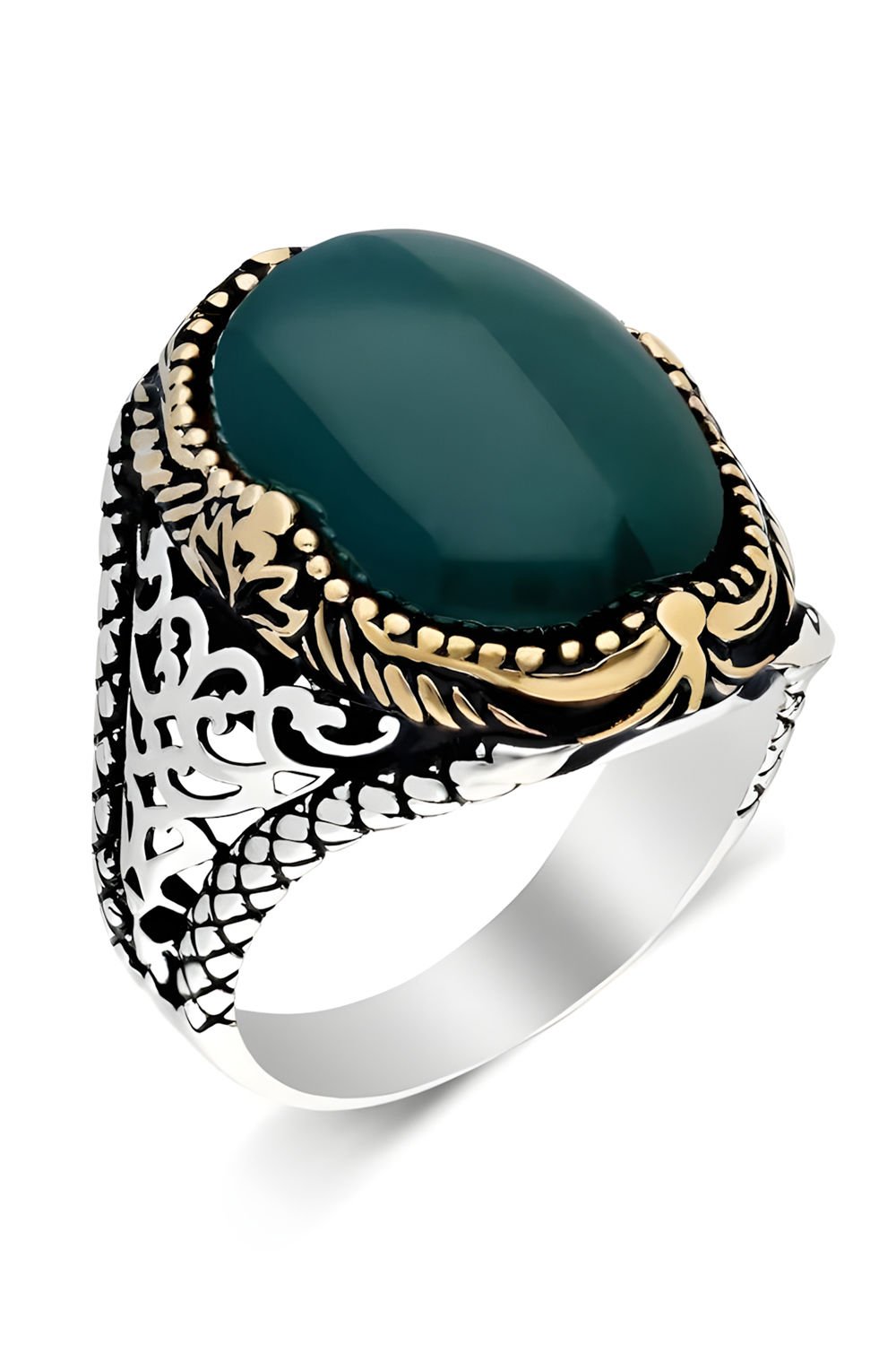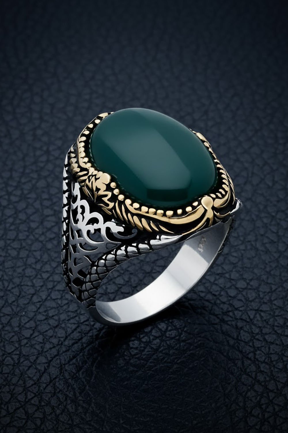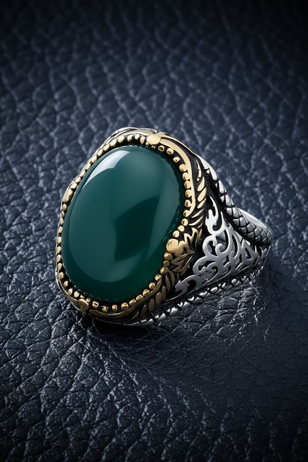 Yüzüğün merkezindeki doğal yeşil akik taşı, doğanın huzurunu ve dengeyi simgeler. 925 ayar gümüşle birleştiğinde ise kaliteli ve etkileyici bir yüzük ortaya çıkar.