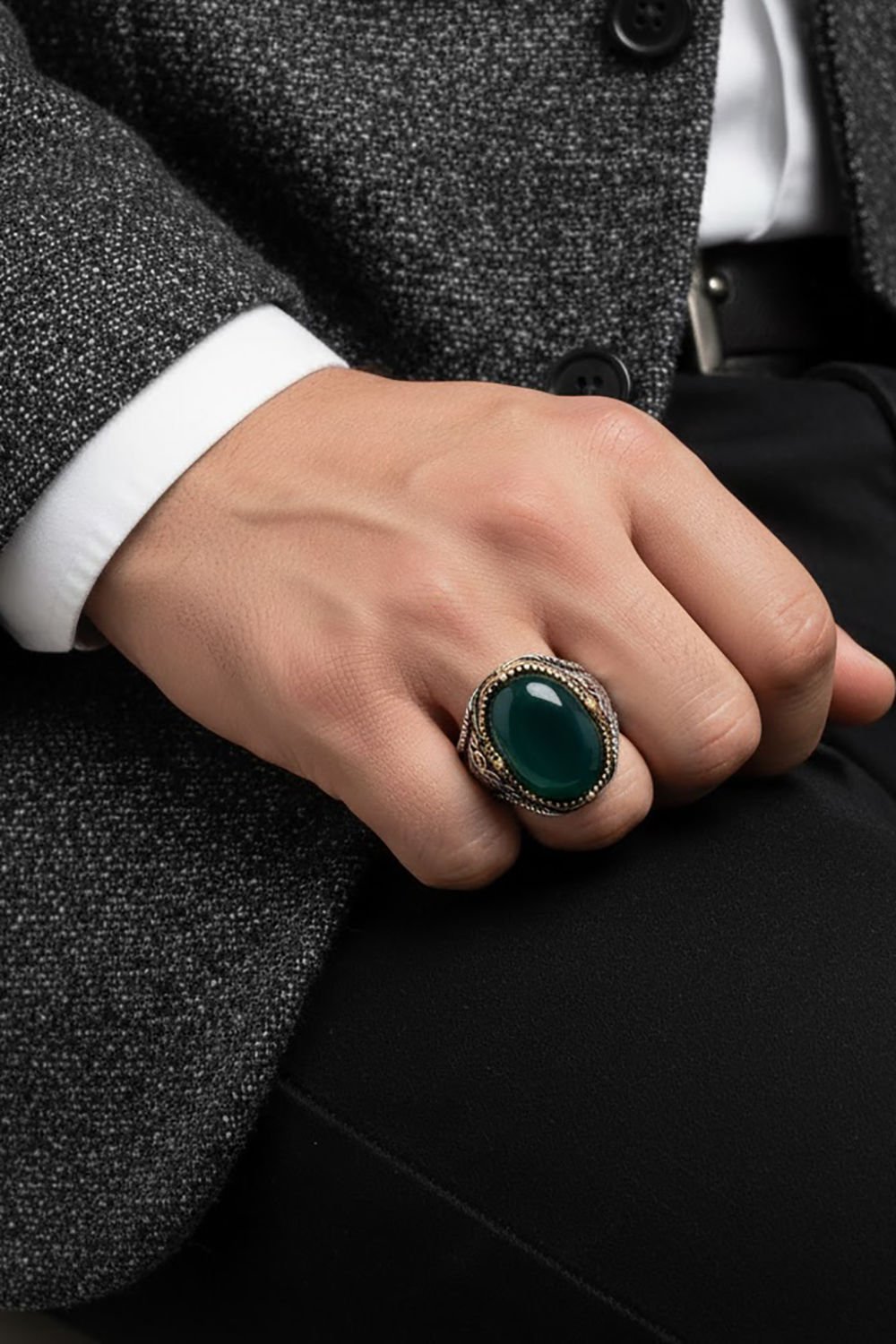 Bu özel erkek yüzüğü, yeşil akik taşı ve 925 ayar gümüş ile özenle tasarlanmıştır. Sade ve zarif tasarımıyla öne çıkar.