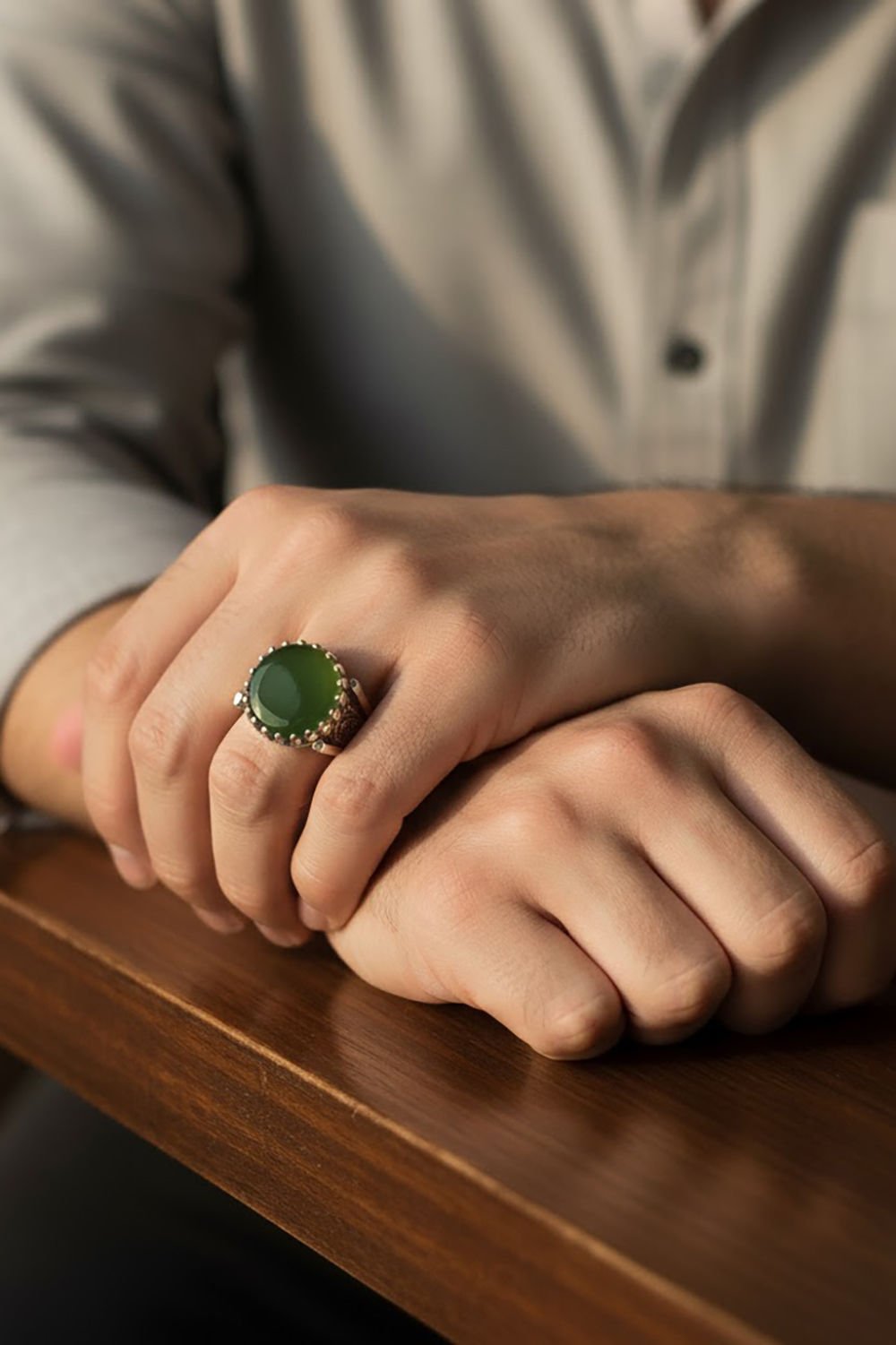 Hakiki ve orijinal doğal taşlar kullandığımız yüzüklerin bu modelinde Yeşil Akik taşını kullanıyoruz.