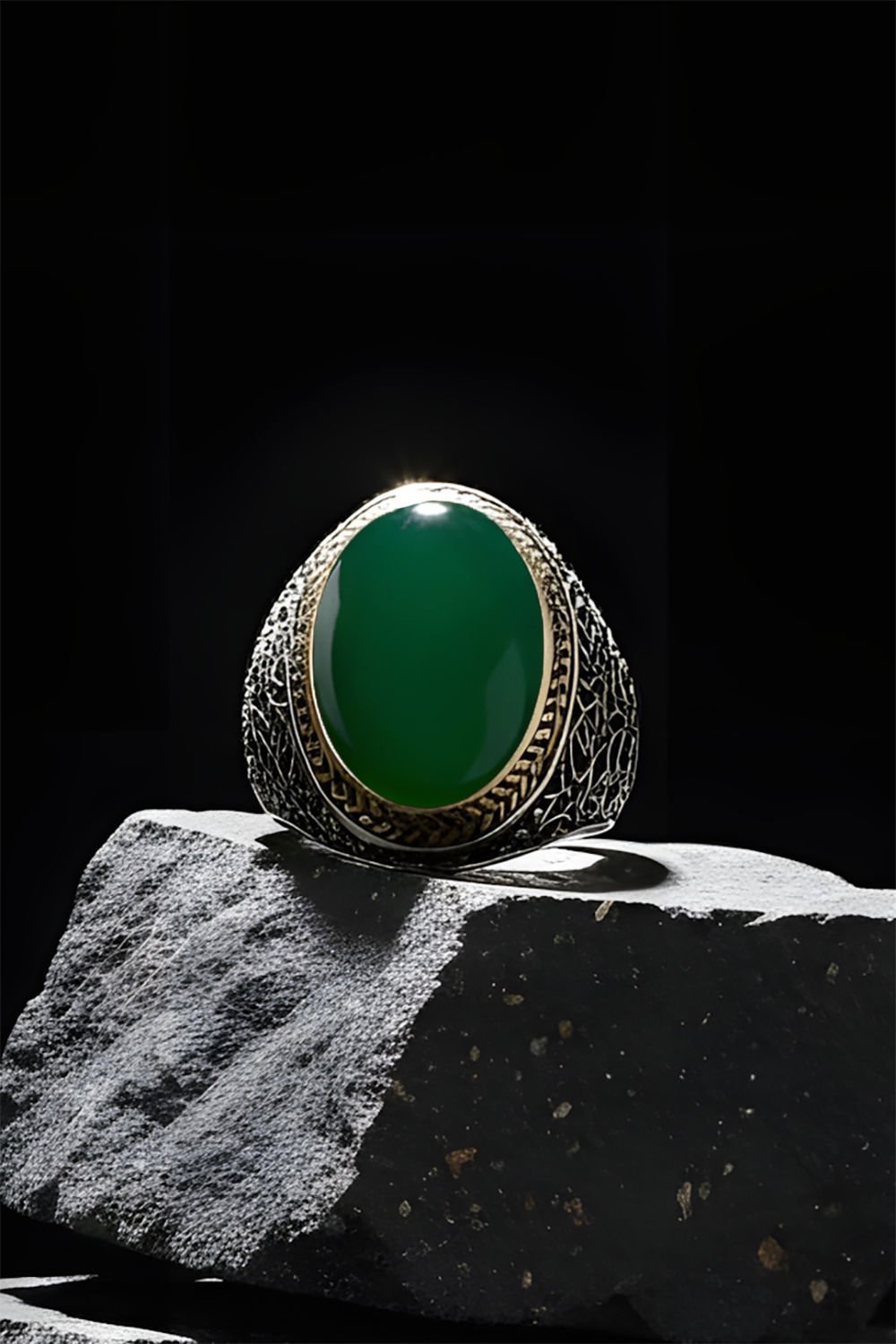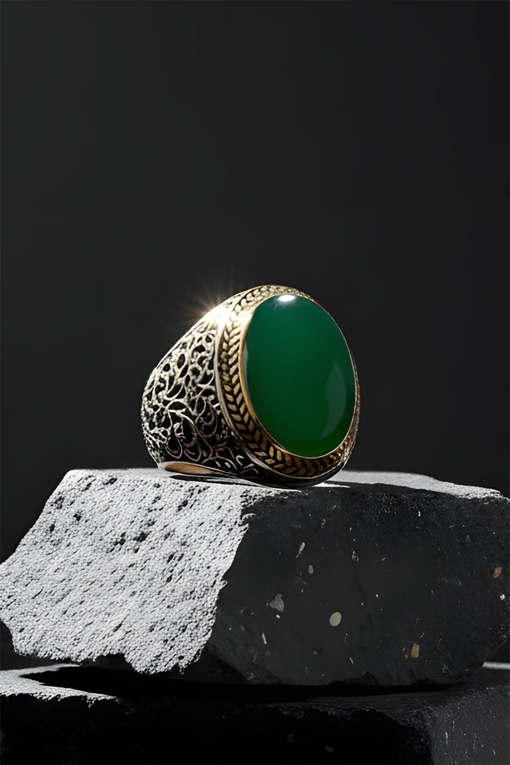 Hakiki ve orijinal doğal taşlar kullandığımız yüzüklerin bu modelinde Yeşil Akik taşını kullanıyoruz.
