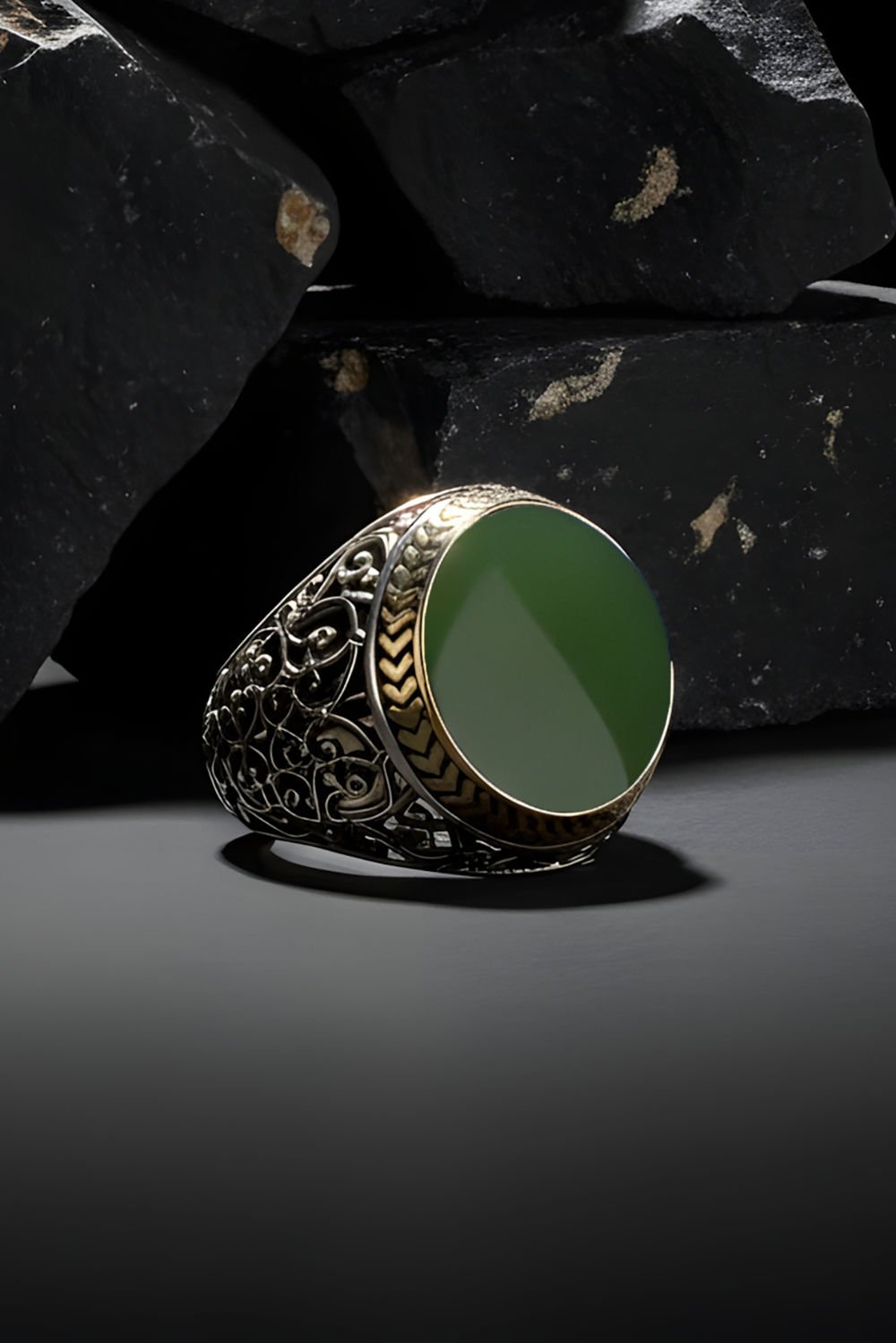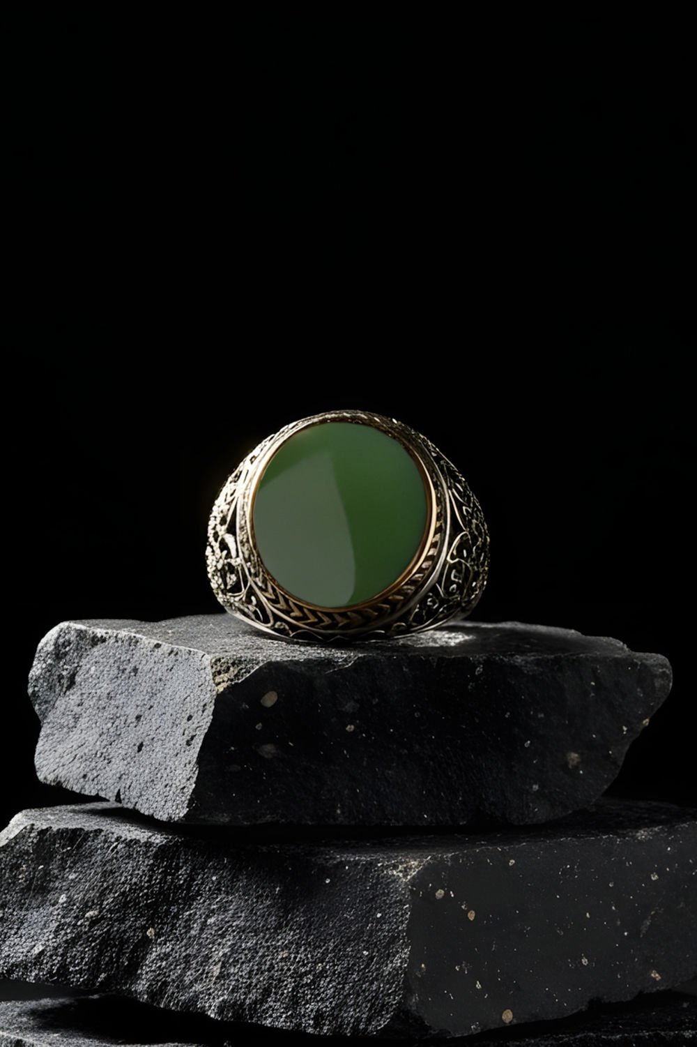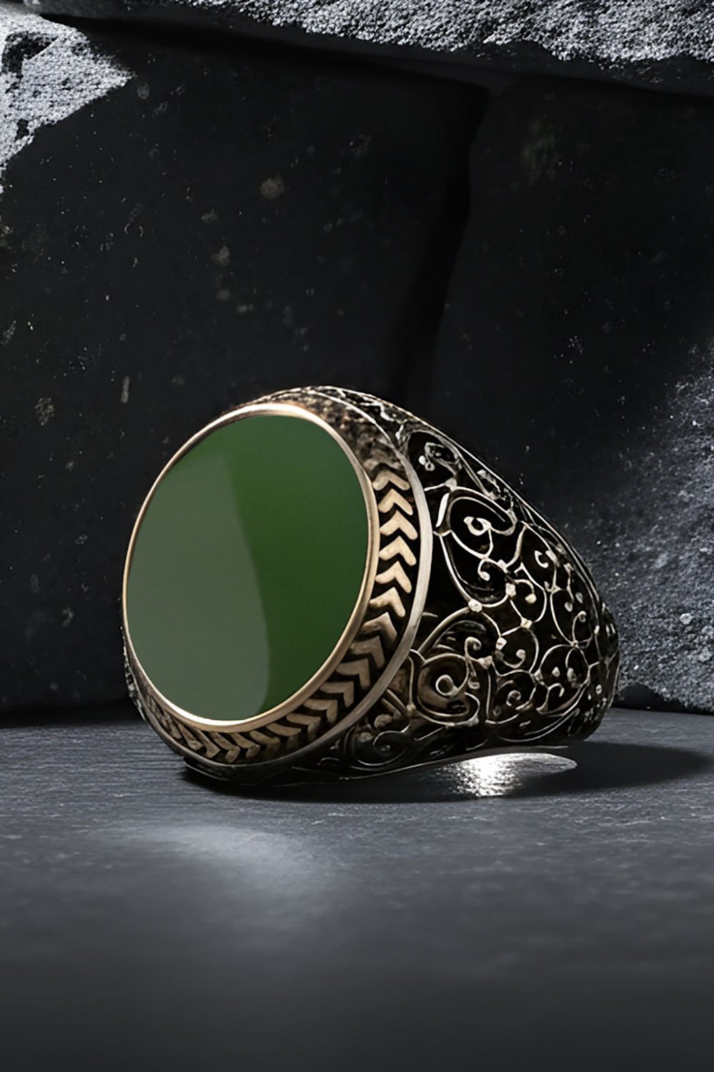 Hakiki ve orijinal doğal taşlar kullandığımız yüzüklerin bu modelinde Yeşil Akik taşını kullanıyoruz.