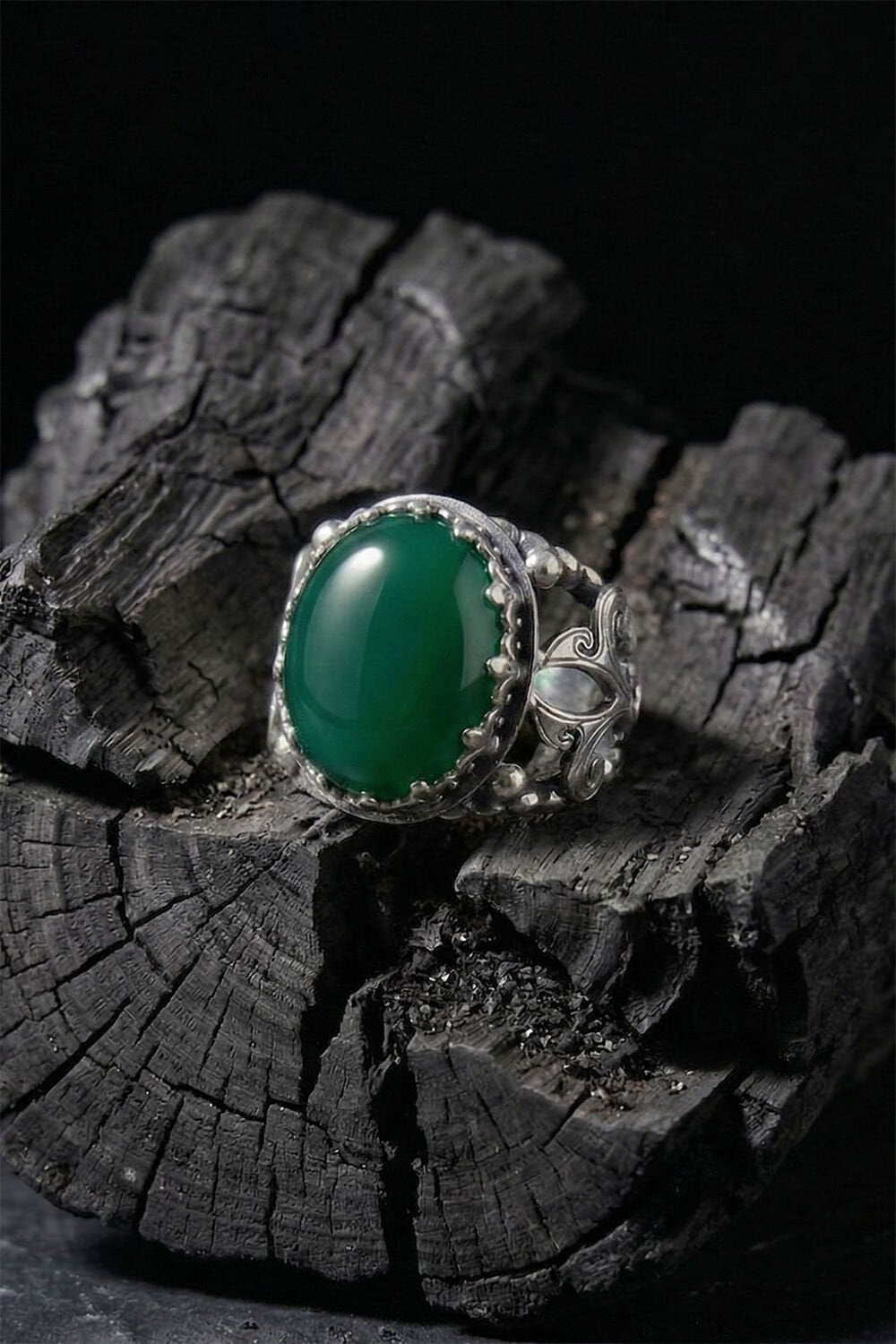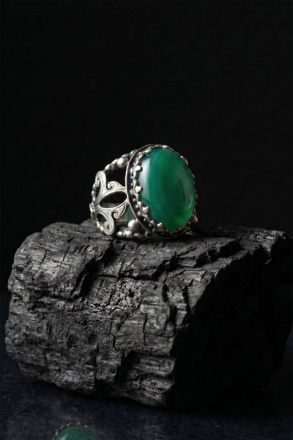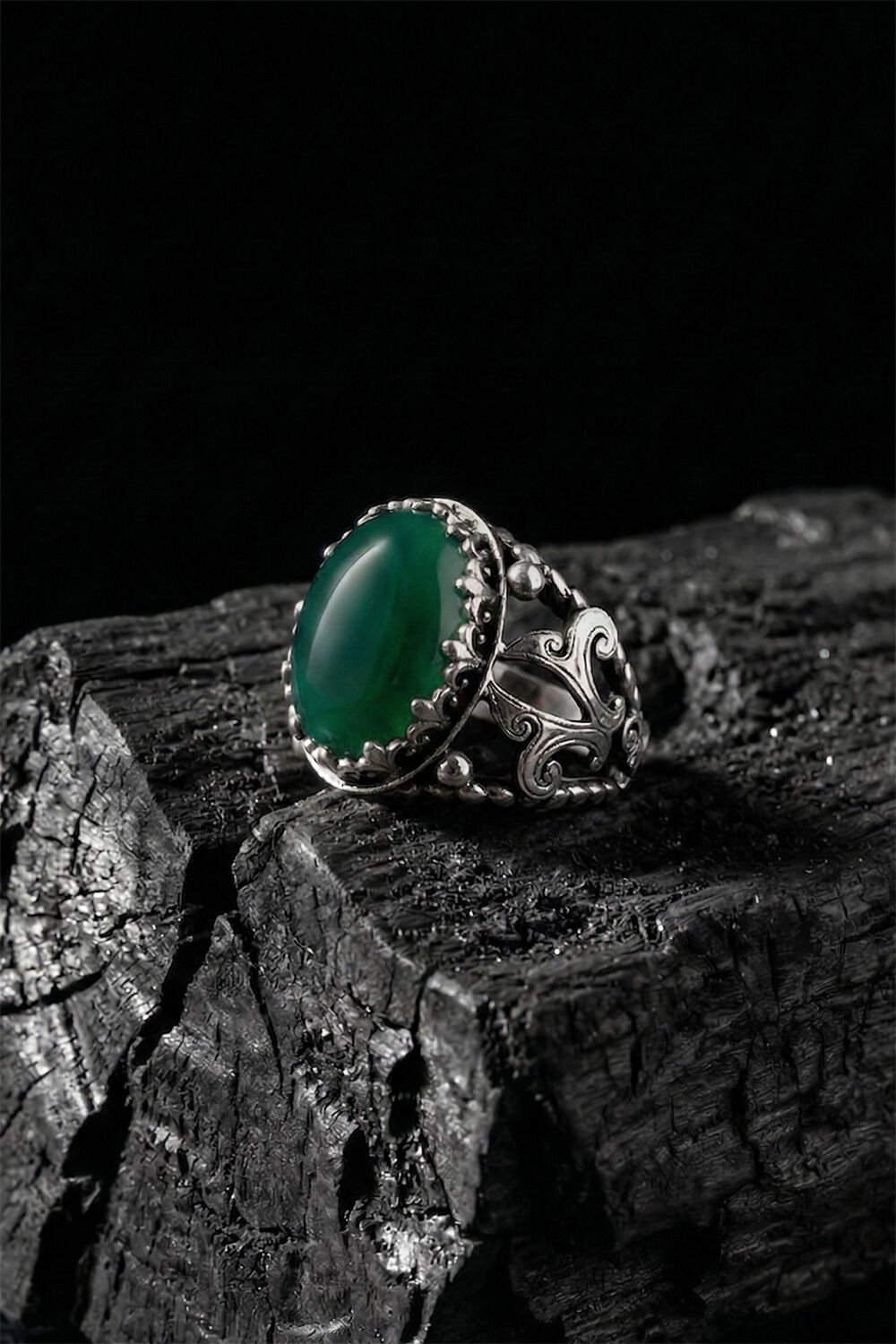 Yeşil Akik Taşlı Zambak Model El İşçiliği Erkek Gümüş Yüzük |