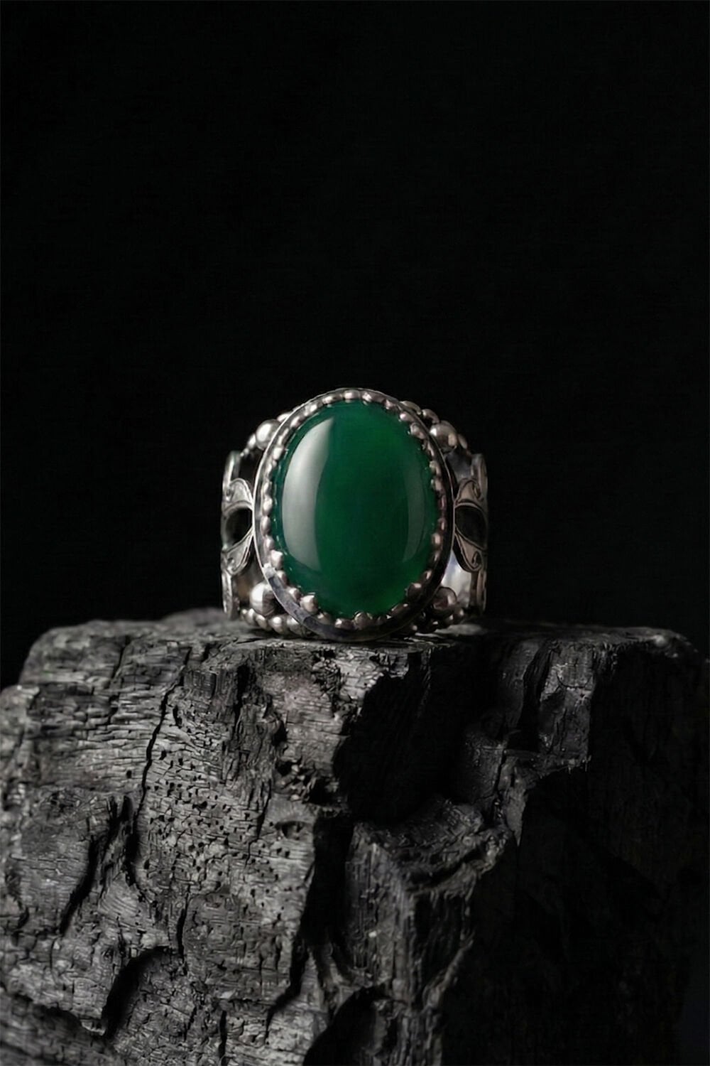 Yeşil Akik Taşlı Zambak Desenli El İşçiliği 925 Ayar Gümüş Erkek Yüzük