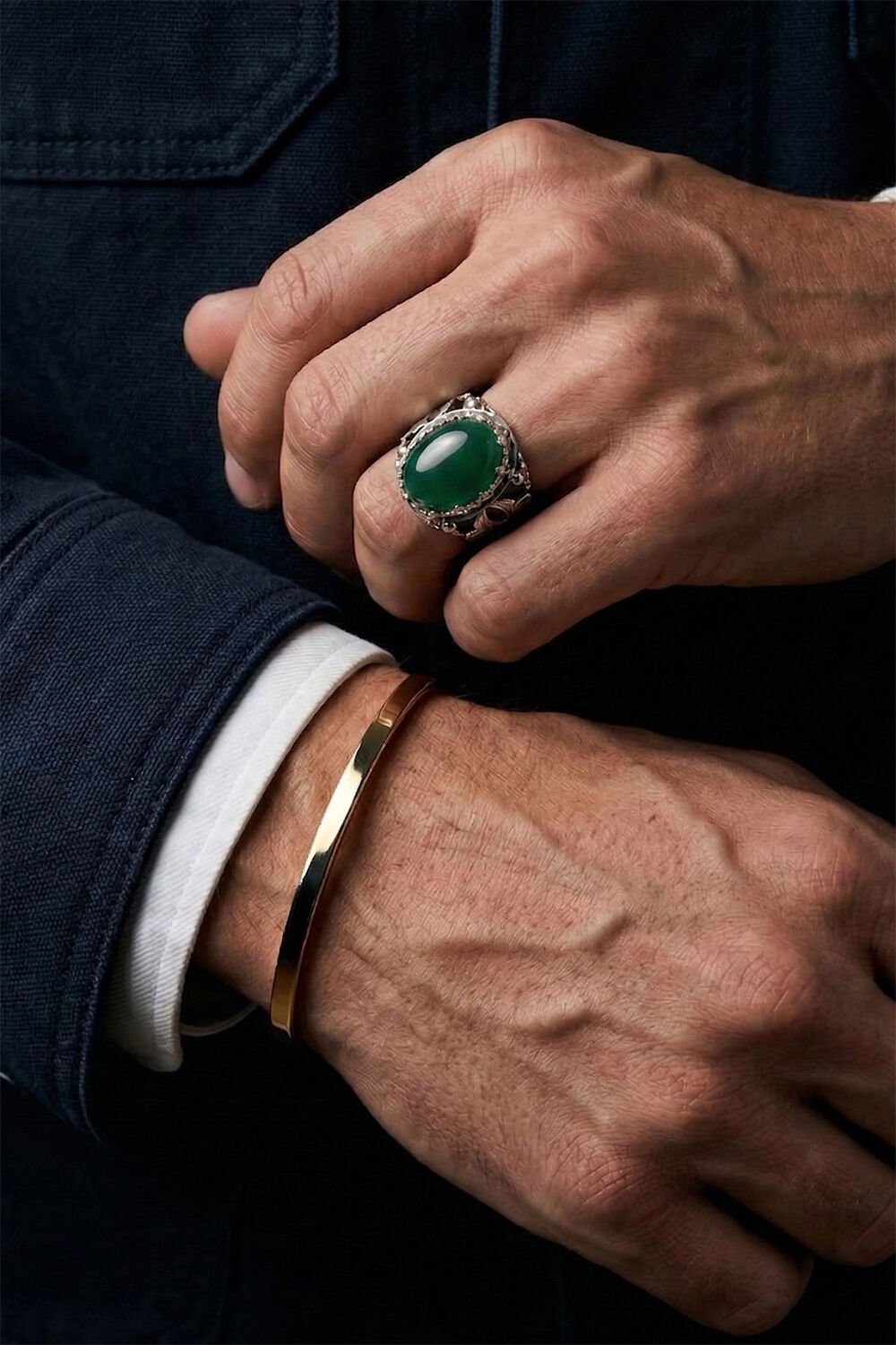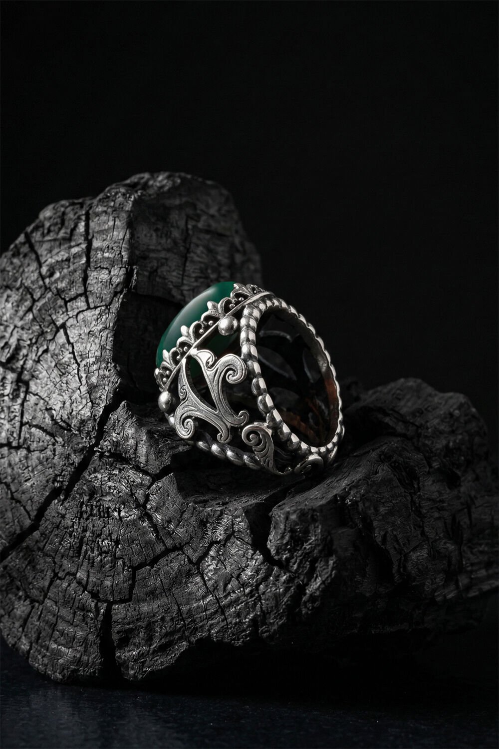 Doğanın Enerjisi ve Ustalığın Buluşması Zarafeti parmaklarında taşımak isteyen beyler için özel olarak tasarlanan bu Yeşil Akik taşlı erkek gümüş yüzük, geleneksel el işçiliğinin en nadide örneklerinden biridir. Yan kısımlarında yer alan asalet simgesi zambak (fleur-de-lis) deseni, yüzüğe hem tarihi bir derinlik hem de modern bir şıklık katıyor.
