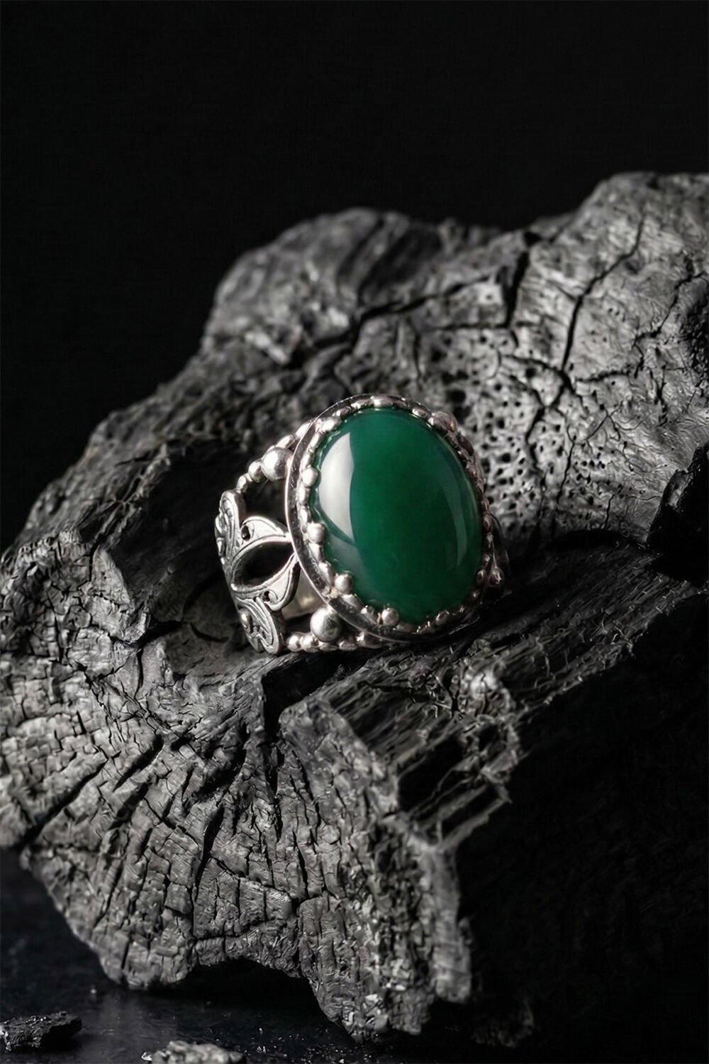 Yeşil Akik Taşlı Zambak Model El İşçiliği Erkek Gümüş Yüzük