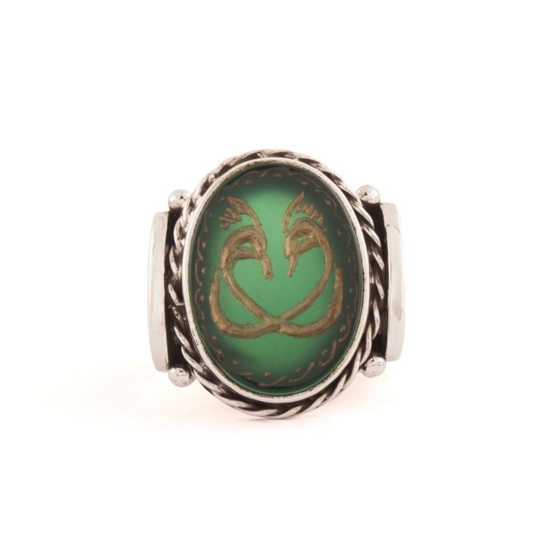 Yeşil Akik Hûd Hûd Kuşu Kazıma El İşi Gümüş Yüzük |