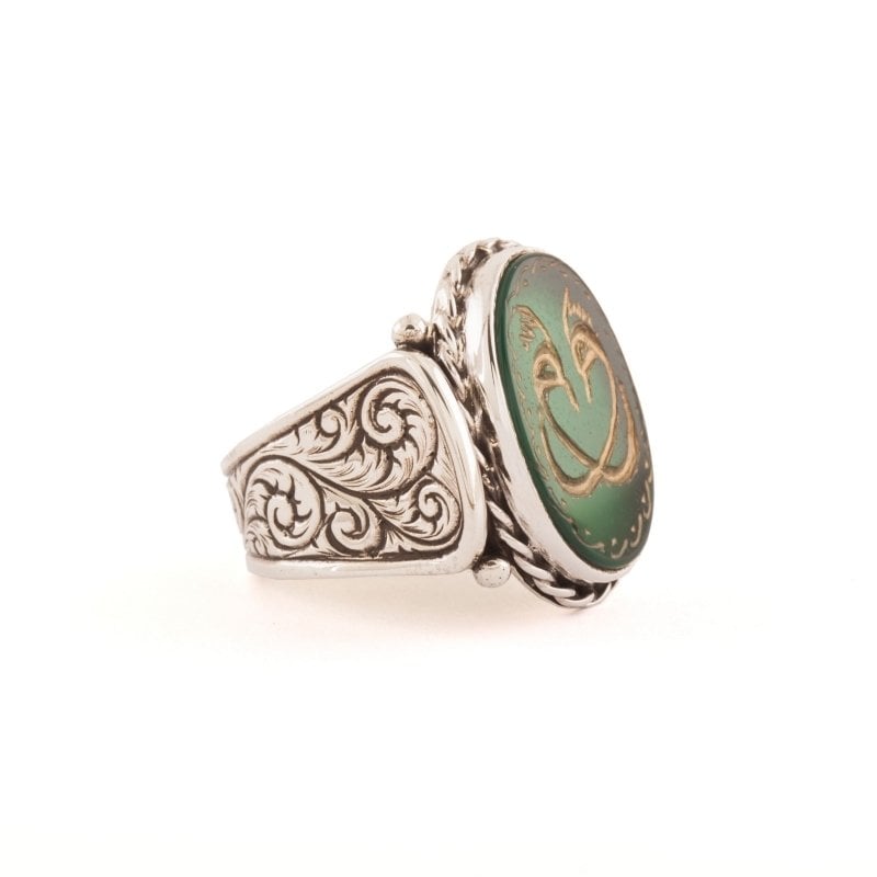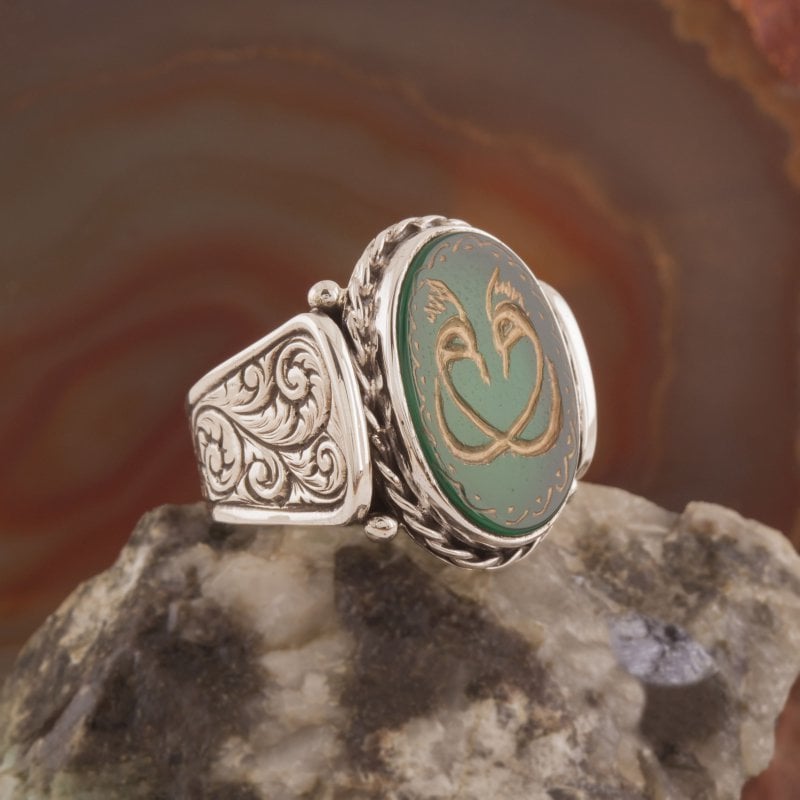 Yeşil akik taşı, doğanın huzurunu ve dengeyi simgeler. Yüzüğün tasarımındaki bu özel taş, kullanıcısına içsel bir sakinlik ve doğayla uyum hissi verir. Yüzüğün üzerindeki hud hud kuşu kazıma detayı ise zarafet ve özgünlük katıyor.