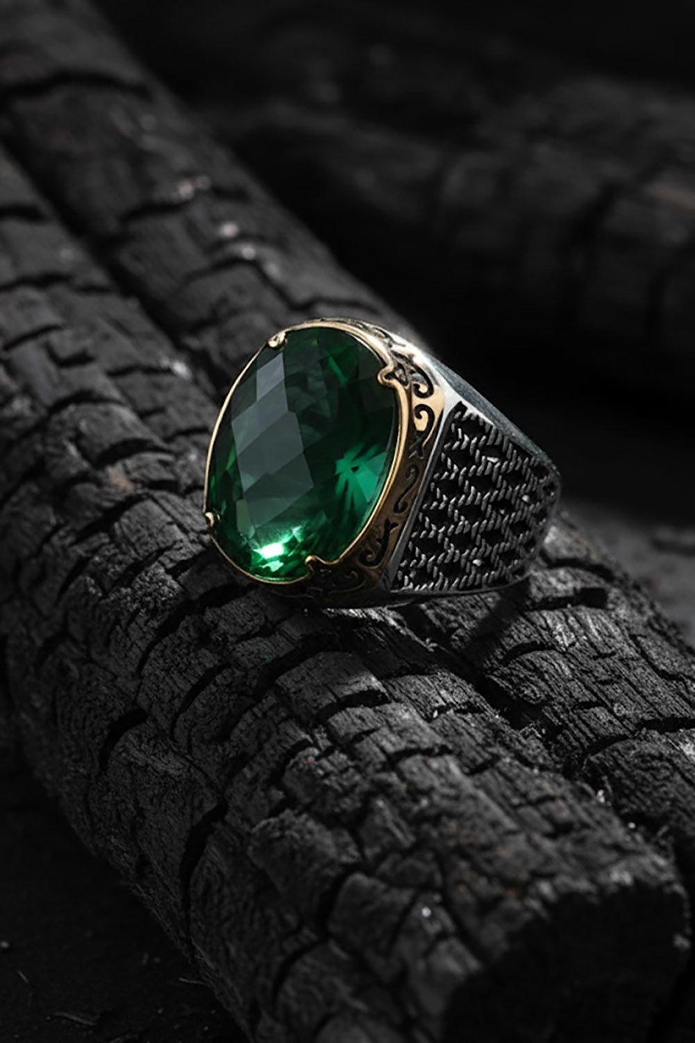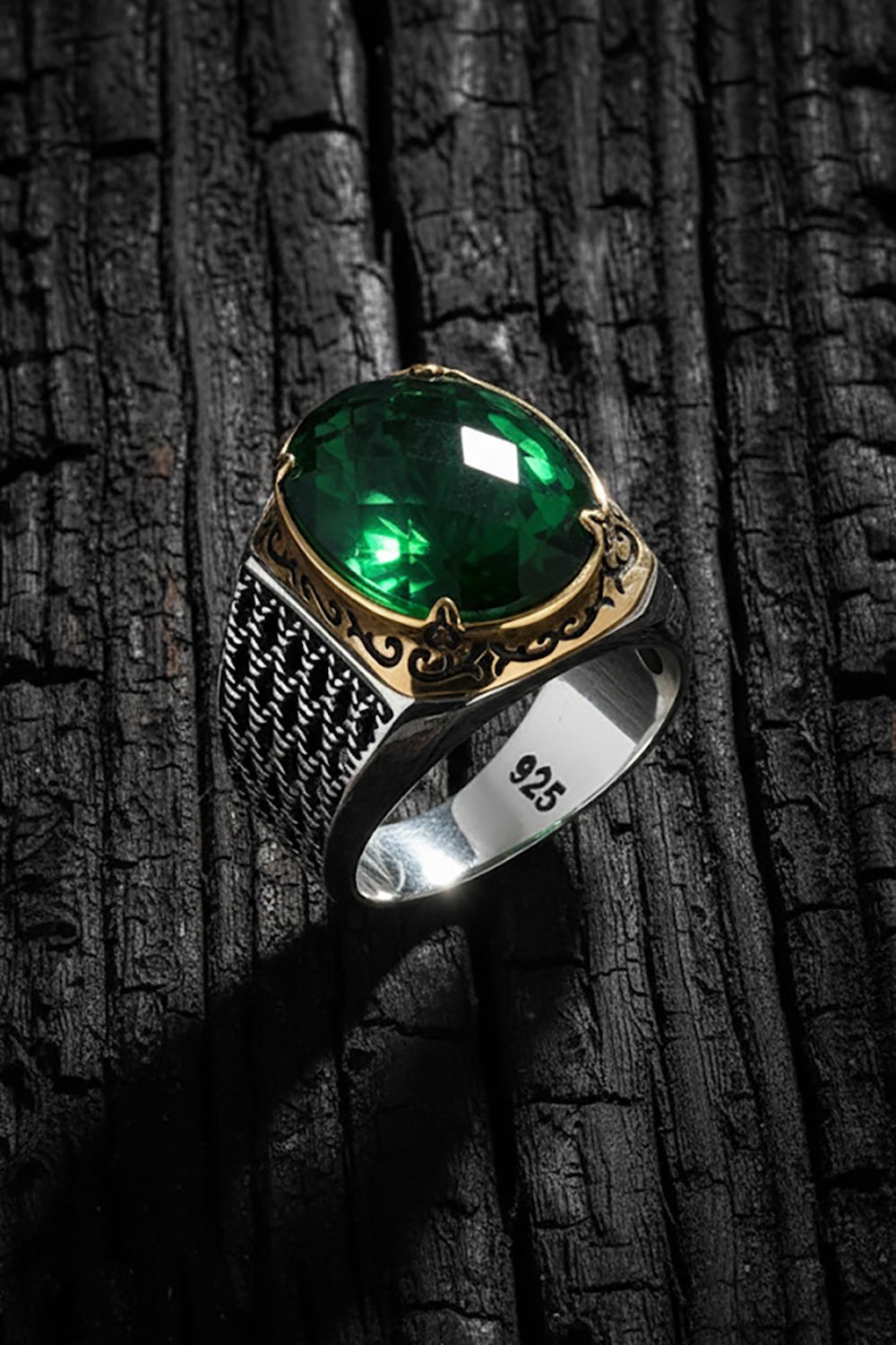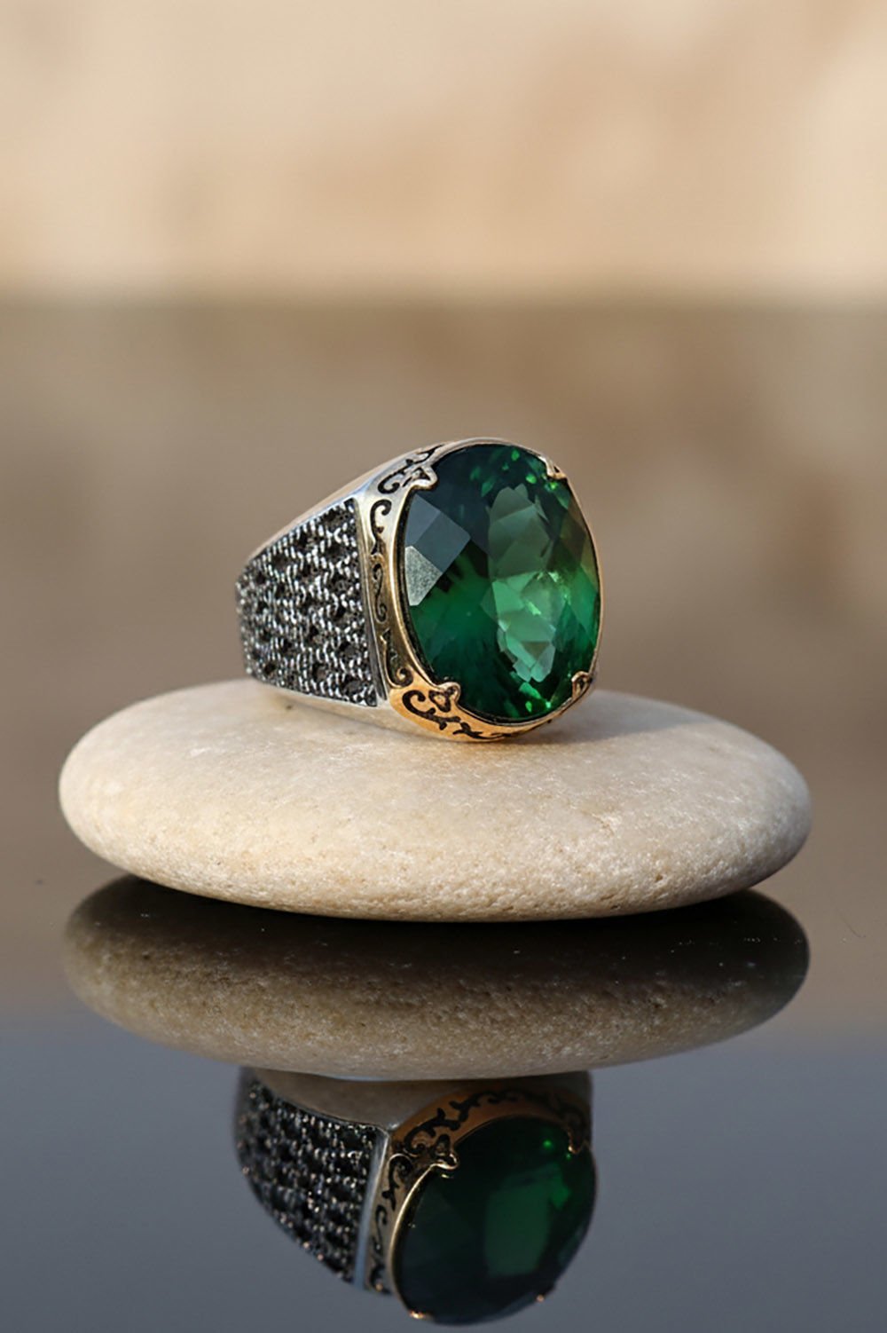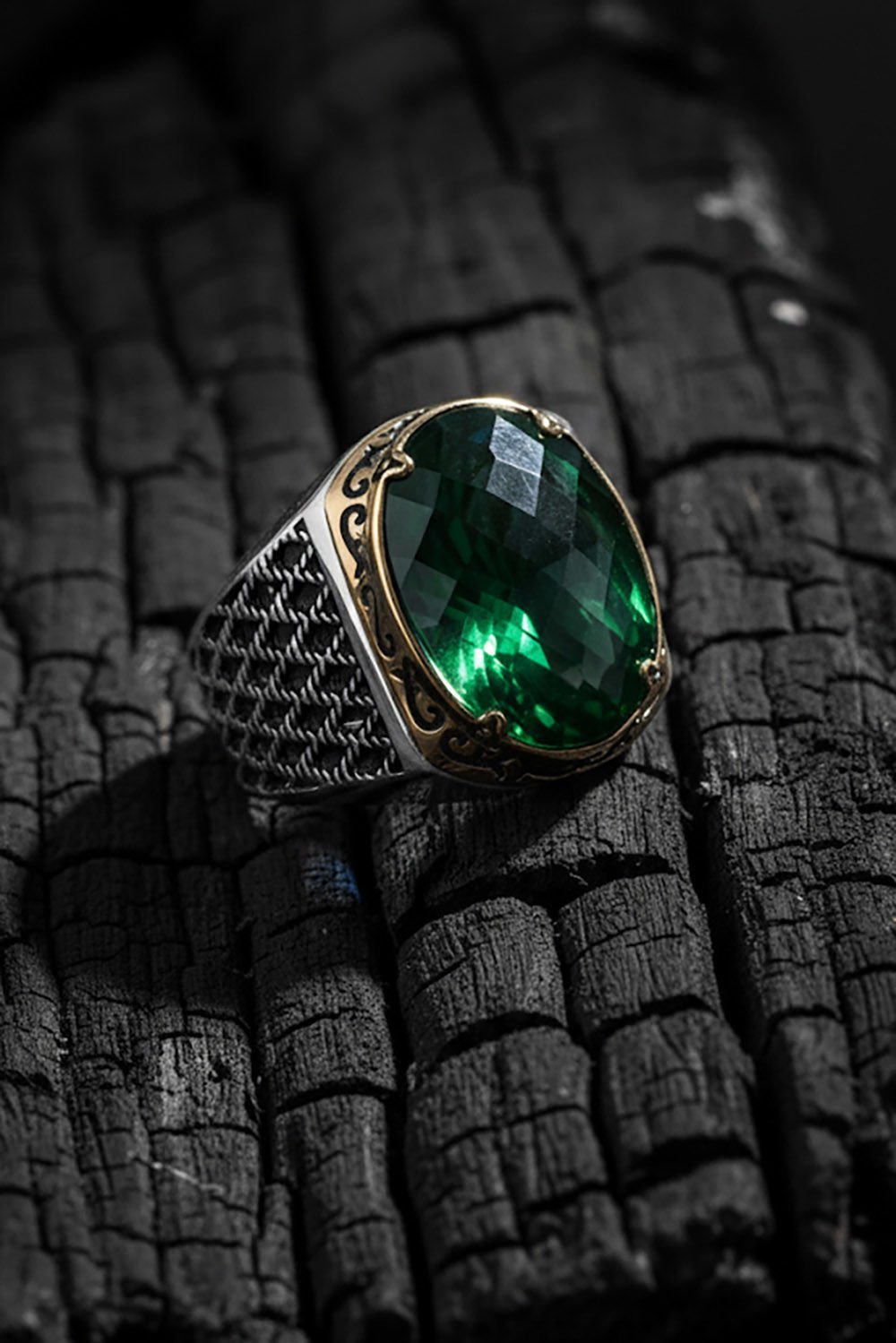 Bu özel erkek yüzüğü, doğal yeşil zirkon taşı ve 925 ayar gümüş ile özenle tasarlanmıştır. El işçiliği ve özel tasarım detaylarıyla göz alıcı bir parçadır.
