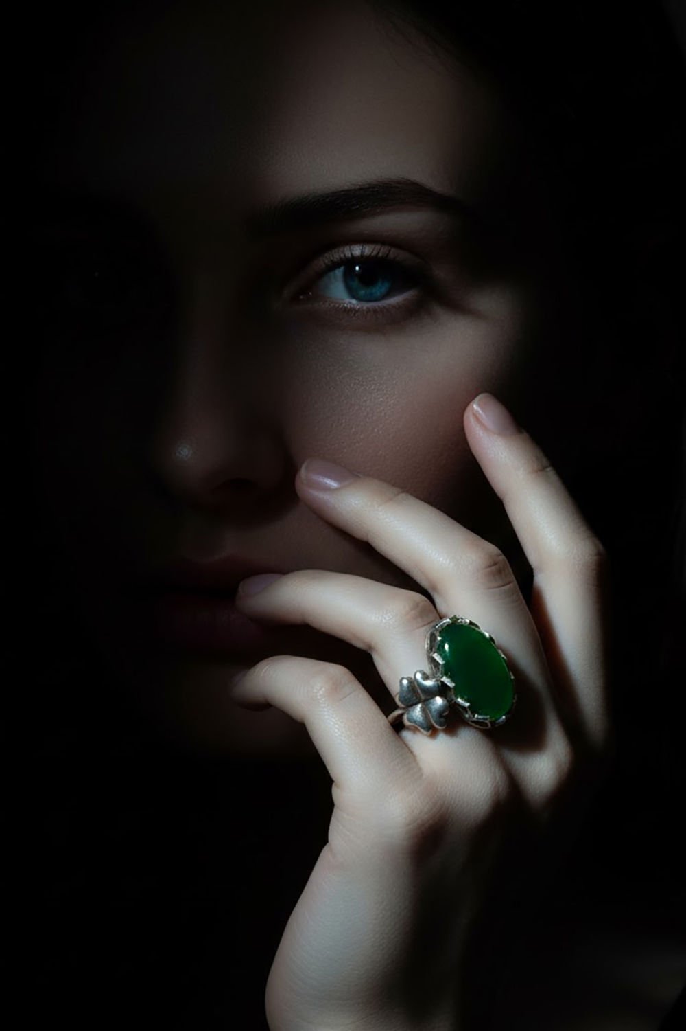Orijinal yeşil akik taşının taze tonları, yüzüğe doğanın tüm canlılığını ve şıklığını katarak, 925 ayar gümüş yüzük detaylarıyla birleşerek etkileyici bir atmosfer yaratıyor. Yonca modeli, modern tasarımı ve gümüşün zarafetiyle birleşerek bu yüzüğü özel kılıyor.