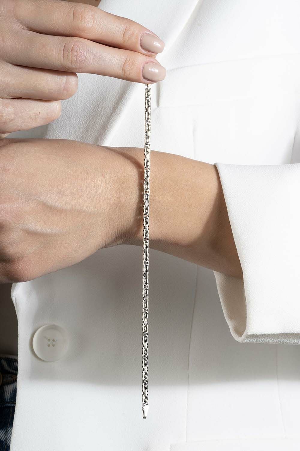 Klasik desenlere sahip gümüş zincir bileklik modelimiz. Bileklik, 925 ayar gümüş ile imal edilmiştir. Sipariş verildikten sonra 1-2 iş günü içerisinde kargoya verilir.